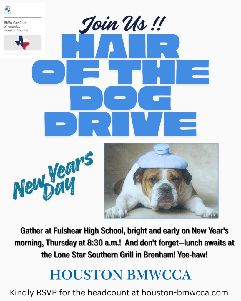 We started it way back on January 1st, 2000. We called it the Hair of the Dog drive. And, 26 years later it’s still on! Don’t. miss this Houston chapter New Year’s Day tradition and join us for the 26th running of the HOD! This year, we’ll be led by our new DriveMeister, Levi Fisk. Here are the details: