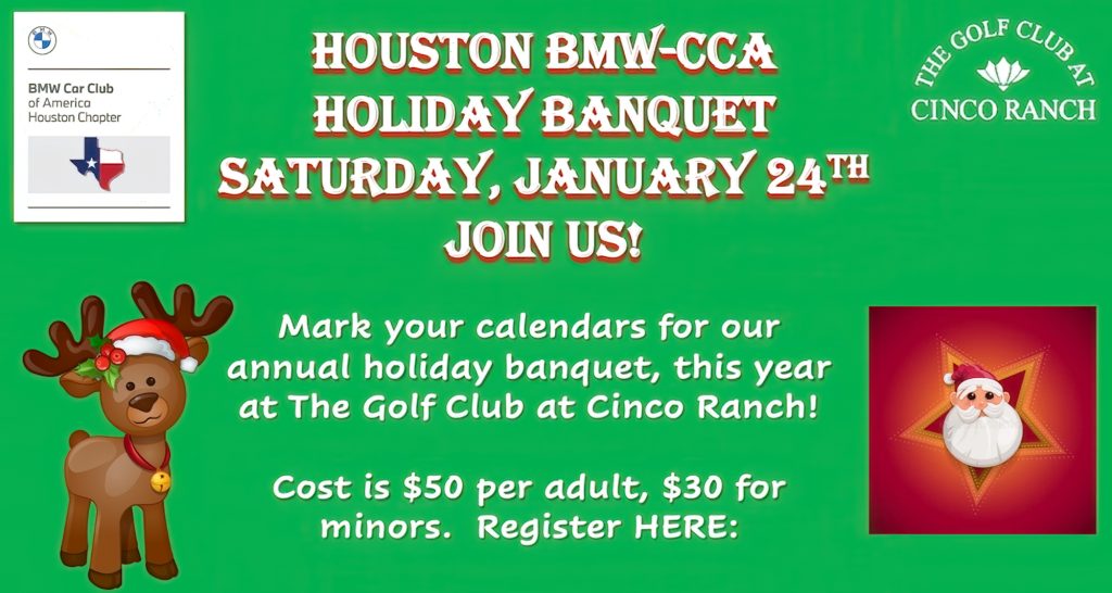Mark your calendars for Saturday, January 24th, 2026. This year we are moving our annual banquet back to the holiday period! We will be at the banquet hall at the Golf Club at Cinco Ranch. The event will run from 6 to 10pm. REGISTER HERE!